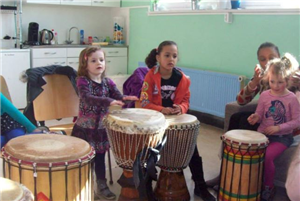 Djembé’s en lesmateriaal zijn aanwezig.