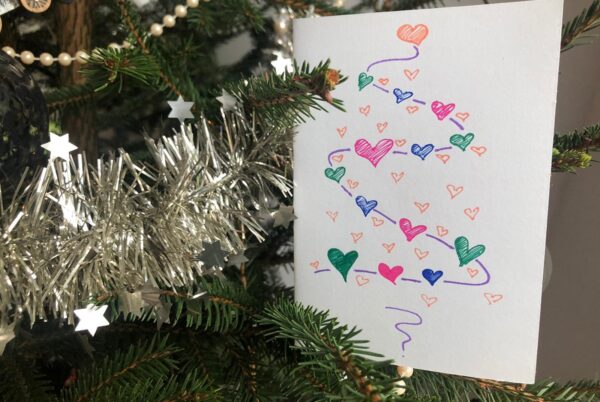 Heb jij alleen papier en stiften tot je beschikking? Geen probleem! Deze kaarten zijn super simpel. Mooie tekst erbij en je bent klaar! Tip: bij de strakke groene kerstboom gebruikte we washitape voor de lijnen die we later wer weg hebben gehaald.