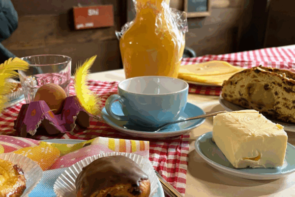 Daarna wandelen jullie samen naar Boerderij Het Gagelgat. Daar staat een lange tafel klaar met croissantjes, een vers eitje, jus d’orange en andere lekkernijen. Even zitten, proeven en genieten van de paassfeer.