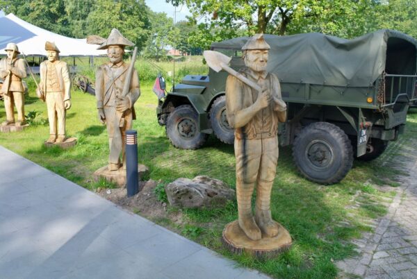Plof neer op het terras van Restaurant Grebbelounge, terwijl de kinderen klimmen op de houten tank en soldaten.
