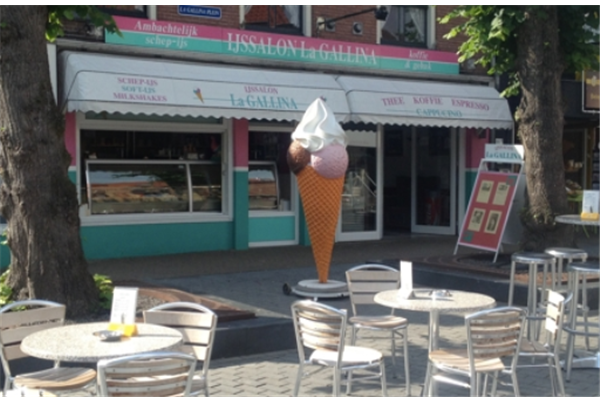 IJssalon La Gallina heeft twee terrassen, één voor de ijssalon en één rustig terras achter de ijssalon. Liever binnen zitten? Of een ijsje meenemen? Dat kan ook!