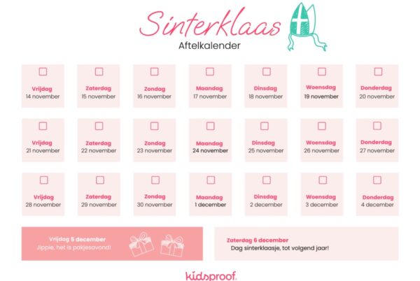 Vraagt jouw kindje ook elke dag hoeveel nachtjes slapen het nog is voordat Sinterklaas jarig is? Maakt het duidelijk met deze aftelkalender. Super leuk om elke dag een vakje af te strepen!