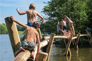 In en over het water zijn bruggen aangelegd, hangen touwen, er staan palen om in te klimmen en er drijven netten en vlotten. Daarnaast is er ruimte om hutten te bouwen, te picknicken of in de zon te liggen.