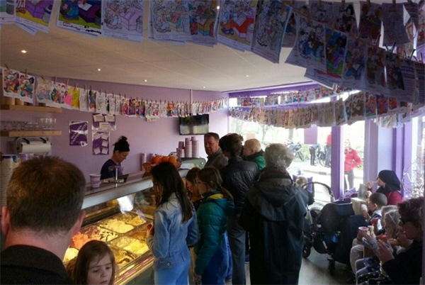 Hier serveren ze zelfgemaakt ijs in allemaal verschillende smaken, zoals Koekie caramel, aardbei, cake beslag, oreo, Kinder Bueno en nog veel meer! Daarnaast hebben ze ijscoupes, milkshakes, ijskoffie, warme wafels en appeltaart.
