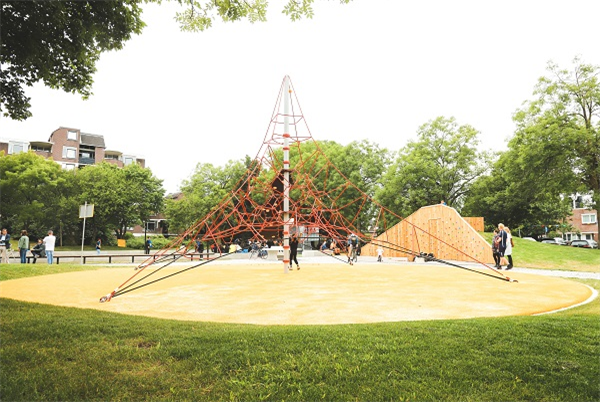 Op het sportveld kunnen verschillende sporten gespeeld worden zoals voetbal, basketbal, hockey en badminton. Aan de overkant van het speelveld is de klimmuur geplaatst, met een valondergrond met geschikte valdemping. Grotendeels van deze materialen is duurzaam hergebruikt van de oude speelplaats!