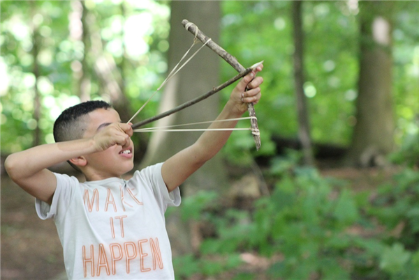 Je wordt ontvangen met horrormuziek. Je verdeelt je groep in teams. Die maken allebei een fort in het bos en ook wapens. Dan ga je aan de slag met zakmessen, zagen, touw en tape. De strijd kan beginnen….