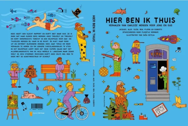 Het (kinder)boek Hier ben ik thuis vertelt persoonlijke verhalen van zes dakloze mensen, om zo een beter en eerlijker beeld van hen te laten zien. Want veel mensen denken bij een dakloos persoon aan een man met een baard die bier drinkt in de bosjes. Of op straat loopt met een winkelwagentje vol spullen. Maar mensen zonder huis kunnen lijken op jou, een leraar, een zakenvrouw of je buurman.