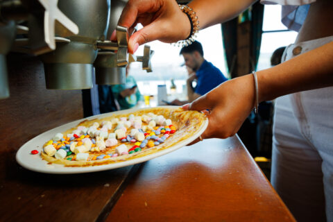 Aan boord kun je onbeperkt smullen van verse pannenkoeken: naturel, spek of appel. Bij het buffet vind je volop zoete en hartige toppings! Van stroop, poedersuiker en hagelslag tot kaas, ham en salami. Zo stel je zelf jouw favoriete pannenkoek samen. En ja, je mag zó vaak terug als je wilt! Heb je een allergie of dieetwens? Dan kun je gebruik maken van het speciale pannenkoekenbeslag.