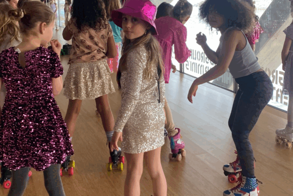 Het kinderfeestje begint met het aantrekken van de schates en een instructie om veilig op de skates te staan. Eerst neem je de tijd om te spelen en je op je gemak te voelen op wielen. Je leert de basis moves en steps op lekkere tunes!