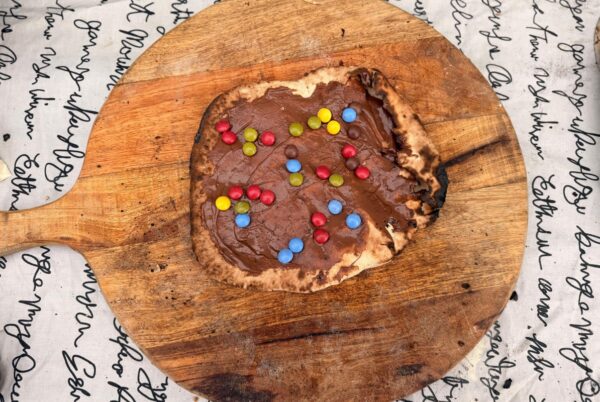 • Ik maakte nog een zoete pizza als toetje: rol een bol deeg uit en bak deze zonder toppings. Als de bodem klaar is kan je hem besmeren met hazelnootpasta en m&m’s. Besmeren voor het bakken = een verbrande pizza. Vertrouw me!
