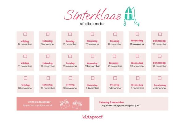 Op zaterdag 15 november komen Sinterklaas en zijn pieten aan in Nederland. Vanaf dat moment tellen wij hier thuis af tot pakjesavond! Met deze handige Kidsproof Sinterklaas aftelkalender wordt dit nóg leuker! Laat dat heerlijke avondje maar komen!