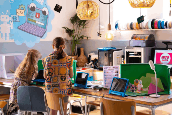 Je ziet kinderen geconcentreerd turen door microscopen, druk in de weer met proefjes of trots hun eigen ontwerp maken met 3D-pennen. Even tussendoor muziek maken, bewegen op de interactieve vloer of samen een filmpje opnemen met een greenscreen, ja dat kan dus allemaal op één plek.