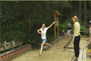 En het is leuke wandeling, met speelelementen voor kids tot ongeveer 12 jaar. Via een wilgentunnel kom je bij een verspringbak. Hier kun je proberen verder te springen dan de dieren.