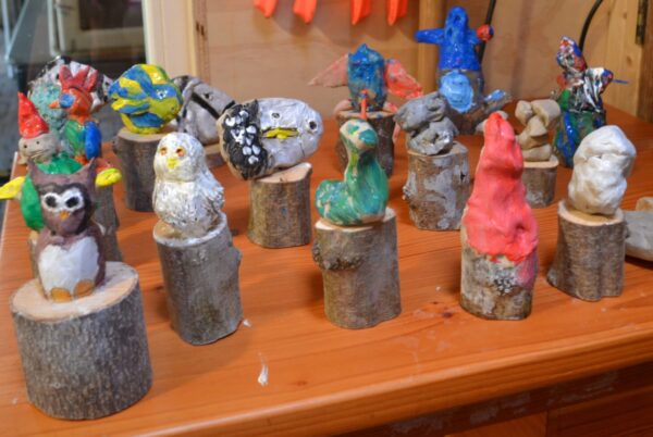 Er liggen voorbeeldplaatjes klaar, maar iets meenemen mag ook. Het dier wordt geboetseerd van klei op een boomstammetje en daarna beschilderd met vrolijke kleuren. Voor ieder kind liggen er zelfs twee stammetjes klaar. Na afloop gaat het kunstwerk natuurlijk mee naar huis.