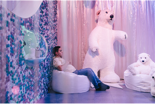 De ruimte is gevuld met kleurrijke lichtjes, tropische geluiden, en zachte materialen die de zintuigen prikkelen en een gevoel van rust en welzijn bevorderen.