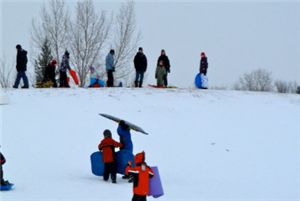 Vanaf het parkeerterrein bij de hondenclub loop je zo het veld op. Daar staat de ideale bult om vanaf te sleeën! Als je het te koud hebt gekregen kun je nog even doorlopen naar Pannenkoekboerderij De Steenen Camer.