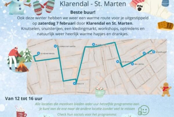 Op zaterdag 7 februari wandel je samen de Warme Winterroute door Klarendal en St. Marten, met onderweg volop knusse activiteiten.