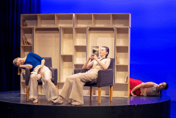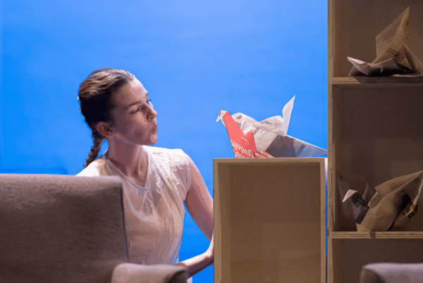 Op het podium staat een draaischijf, keurig in tweeën opgedeeld door een boekenkast. Wanneer een boek doormidden wordt gescheurd, komt de wereld eromheen in beweging.