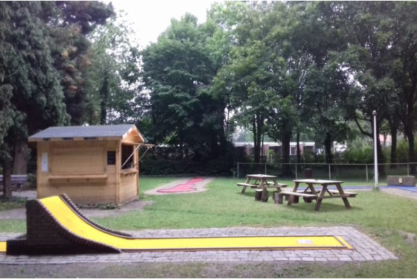 Naast de midgetgolfbaan, waar ook een reuze vier-op-een-rij schommel voor de kinderen staat, is er ook een friettent met verse frietjes aanwezig en een mogelijkheid om binnen te zitten.