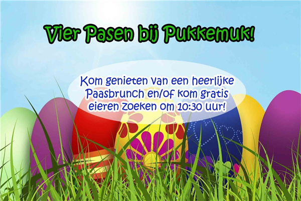 Komen jullie Pasen vieren bij Pukkemuk?! Om 10:30 kunnen alle kinderen buiten Paaseieren zoeken! Daar zitten geen extra kosten aan verbonden. Daarnaast kunnen jullie reserveren voor een heerlijke Paasbrunch voor slechts €22,00 per persoon inclusief entree!