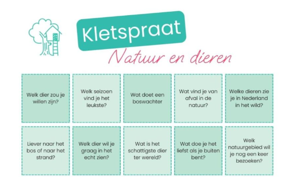 Wat is je favoriete plek om buiten te spelen? En wat zou je doen als je de baas was over de natuur? Deze en meer leuke vragen vind je in de Kidsproof Kletspraat Natuur & dieren. Je download ‘m hieronder helemaal gratis. Klik op de foto of roze button en print ‘m uit!