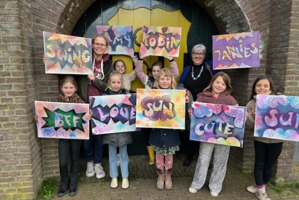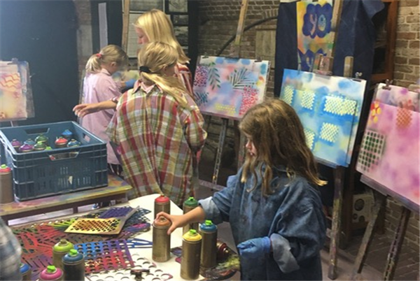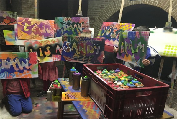 Na binnenkomst krijgen de kinderen een korte rondleiding door het Fort Orthen. In het atelier zelf wordt e.a. uitgelegd over graffiti.