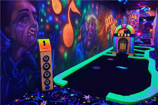 GlowGolf is het allernieuwste uitje in Waalwijk! Een spectaculaire glow-in-the-dark-minigolfbaan met 15 uitdagende holes, in een waanzinnig 3D decor dat wordt uitgelicht met blacklights. GlowGolf Waalwijk heeft het thema ‘MUZIEK’ en dit komt overal in terug: de baan, wanden en beelden. Het is een ‘trip down memory lane’ van Jimmy Hendrix en The Beatles tot aan KISS, Disco Fever, Beyoncé, Tiesto en vele anderen. De vette remixen van alle grote hits zorgen voor heerlijke vibes op de baan.