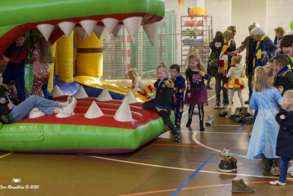 Voor kinderen is er van alles te beleven. De gymzaal verandert in een vrolijk speelparadijs met opblaasbare toestellen waar lekker geklauterd en gesprongen kan worden. In de grote zaal zijn optredens van verschillende clubkes, klinkt er gezellige carnavalsmuziek en kunnen kinderen zich laten schminken. Natuurlijk zijn (groot)ouders ook van harte welkom om mee te genieten.