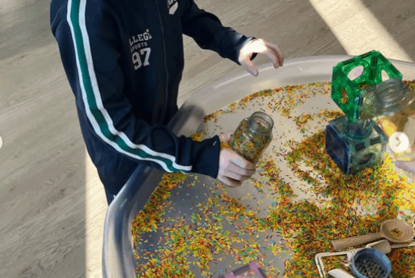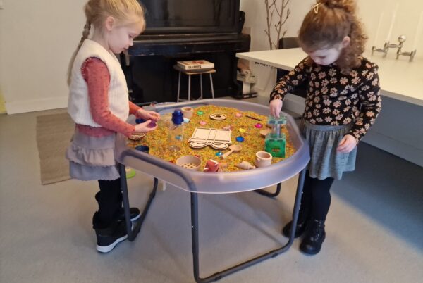 Denk aan speelstations met droge materialen zoals rijst, linzen en pasta. Half-plakkerige materialen zoals kinetisch zand. En natte materialen zoals water, modder en scheerschuim. Daarnaast is er een constructiehoek, een fidgetstation en ruimte voor kunstzinnige activiteiten.