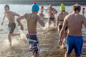 Daarna volgt het aftellen en gaat iedereen tegelijk het water in.