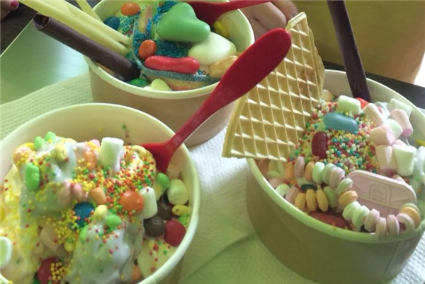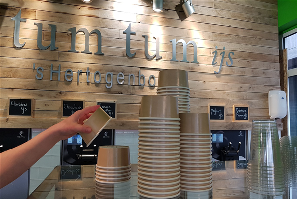 Het werkt erg simpel. Als eerste pak je een bakje. Het formaat van het bakje is niet zo belangrijk, wel wat je er in doet. Je betaalt per gewicht, dus alleen de hoeveelheid ijs waar jij zin in hebt reken je af. Als je een klein ijsje wilt tap je wat minder en als je zin het in veel ijs, tap je je bakje vol.