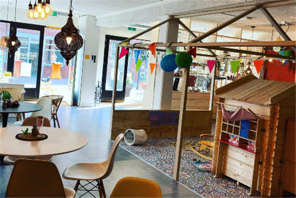 Hier zit je met zicht op de speelhoek waar kinderen kunnen spelen. Ook buiten is er ruimte. Op de kaart staan ontbijt, lunch en een kindermenu. Er zijn regelmatig activiteiten zoals voorlezen en kindertheater.