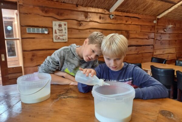 - Onder begeleiding ingrediënten verzamelen voor koekjes: boter maken, graan malen, eieren garen