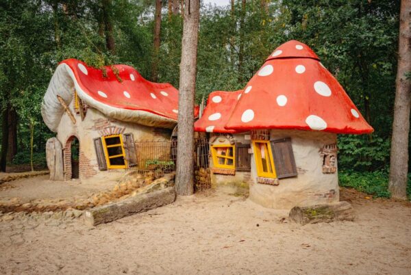 Bij aankomst kunnen de grote paddenstoelen niet missen. Je mag erin spelen, met modder knoeien in het beekje of rondrijden met de kruiwagens. Volg ook de kabouters ook naar binnen, daar is een ballenbak en kun je naar binnengluren bij de kleine huisjes!