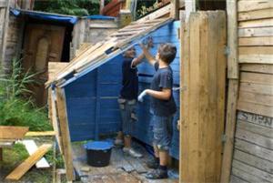 Je kunt dan samen bouwen aan een feesthut en meedoen met de activiteit van de dag. Je krijgt limonade, snoep en patatjes (dit kost € 4,- p.p.)Als extra kan je de knutselschuur met terras huren voor je feestje. Dan kan je met max. 15 kinderen gebruik maken van deze schuur om de verjaardagstaart te eten, kadootjes uit te pakken en natuurlijk iets knutselen met het aanwezige knutselmateriaal. Dit kan binnen, maar ook op het terras voor de schuur. Tegenover de schuur kunnen de kinderen werken aan hun feesthut.