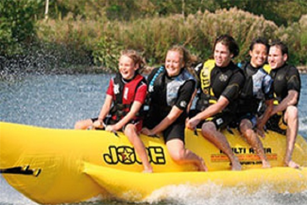 De banaan wordt voortgetrokken door een stoere speedboot. Let op! Droog blijven is geen optie!