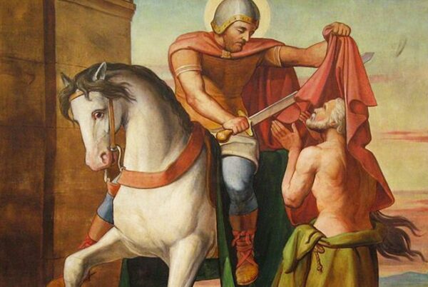 Hij stapte van zijn paard af en sneed met zijn zwaard zijn eigen mantel doormidden en gaf de arme man een helft tegen de kou. Pas daarna vervolgde Martinus zijn weg naar huis.
