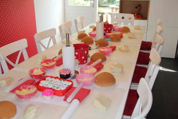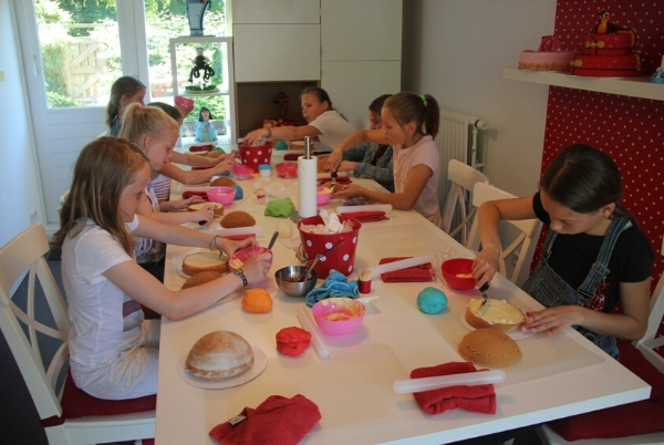 Bij dit feestje ligt er een biscuitbasis (bolletje van 15 cm doorsnede) voor de kids klaar. Deze vullen ze zelf met een botercrèmevulling en jam. Daarna gaan we het taartje bekleden met (zelfgekleurd) marsepein en kan vervolgens het versieren beginnen.