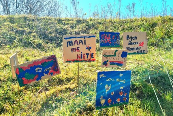 Ook maken jullie een maai-me-nietbordje. Zet dit bordje op een plek waar bloemen in mei lekker mogen blijven staan. Zo help je bijen en andere insecten aan meer voedsel.