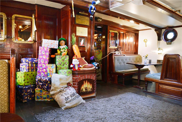 Aan boord kunnen de kinderen zien hoe de Sint en zijn Pieten leven en werken. In de kombuis maken de Bakpieten pepernoten, marsepein, borstplaat en ander lekkers. In het pakjesruim zijn de Inpakpieten koortsachtig bezig alle cadeaus voor de kinderen van Nederland in te pakken. En als de kinderen heel stilletjes doen mogen ze ook nog een blik werpen in de slaapkamer van Sinterklaas. In de werkkamer ontmoeten de kinderen de Sint achter zijn bureau met het Grote Boek van Sinterklaas.