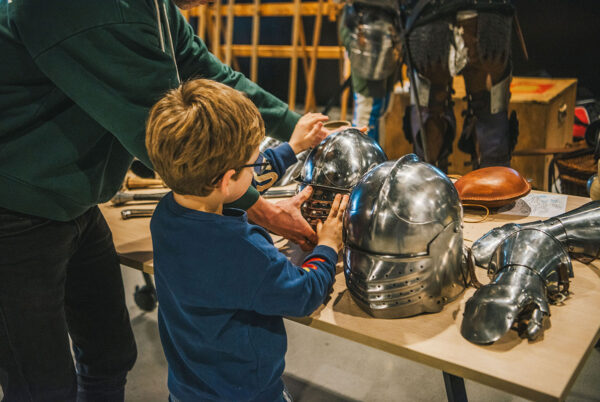 De ridder neemt je mee in zijn wereld. Bekijk de wapens van dichtbij en vraag de ridder het wapenkleed van z’n lijf!