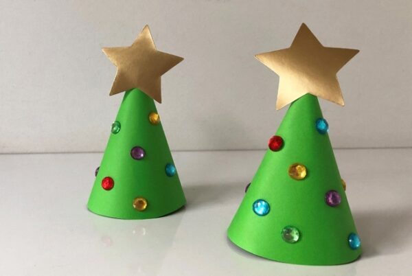 Knip een cirkel uit een groen papier en knip deze half door. Vouw de halve cirkel rond, zodat de vorm van een kerstboom ontstaat. Plak deze uiteinde vast met lijm en beplak je kerstboompje met mooie glitter stickers voor een feestelijk effect.