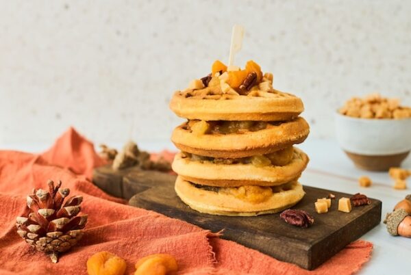 Pumpkin spice-smaak is altijd goed voor instant herfstvibes! Deze wafels met pompoen, appel-abrikozencompote, karamel en pecannoten zijn perfect om samen te maken op een grijze herfstmiddag — stapelen, druppelen & smullen maar! Deze link opent in een nieuwe tab
