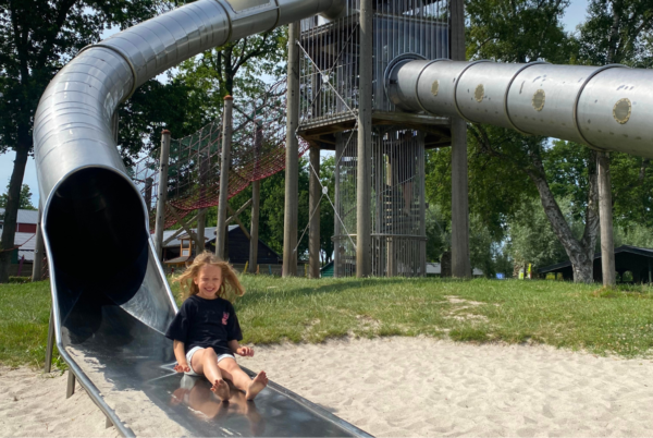 Het achterveld heeft iets weg van een showroom voor speeltoestellen. Voor alle leeftijden zijn er klimrekken, schommels en glijbanen te vinden. Een grote speeltuin waar kinderen lekker zelf hun gang kunnen gaan. Het zonnetje schijnt, dus ik zoek een plekje in het gras waar ik even lekker kan zitten. Af en toe hoor ik ineens “Mam! Kijk eens!” en dan zie ik in de verte een vrolijk meisje zwaaien. Helemaal in haar element. Een minuut later staat ze ineens in de toren van een kasteel. En dan weer op het dak van een trein.