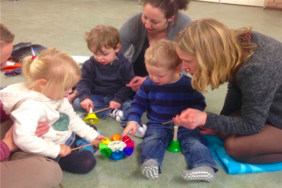 Ouder-kind lessen in de gymzaal, onder begeleiding van professionals
