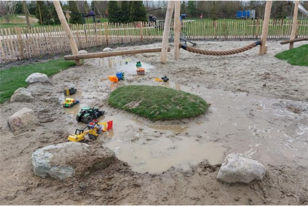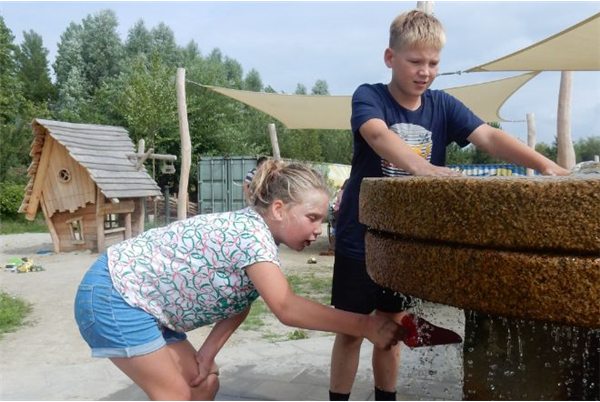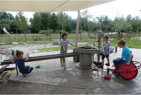 Voor jongere kinderen, kinderen die behoefte hebben aan een veilige, overzichtelijke omgeving en kinderen met een verstandelijke beperking is er een afgeschermde omgeving waar het voor alle kinderen mogelijk is om te spelen met zand en water en waar zij hun fantasie en energie kwijt kunnen. De waterspeeltuin is op een verharding geplaatst met een rolstoeltoegankelijke moddertafel en verharde paden.