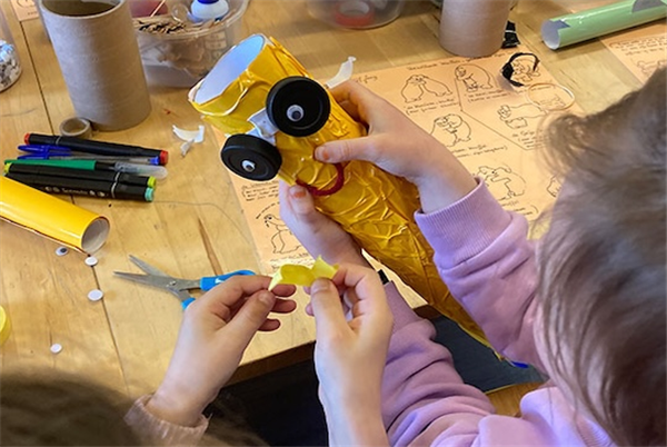 Rommelige Robots? Zoek de mooiste materialen bij elkaar en werk met z’n allen aan één grote robot of ieder aan een eigen. Boor gaatjes in kroonkurken voor de ogen, gebruik fietsspaken als antenne, of knip zilveren vloer-isolatie tot stukjes voor de armen. In het magazijn is van álles te vinden!