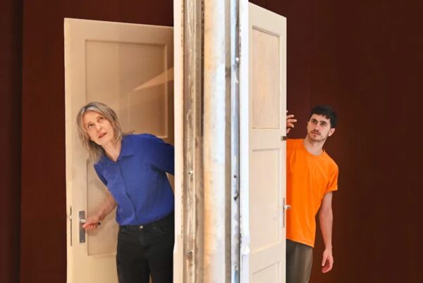 Hij kijkt vooruit, zij terug. Hun kamers draaien om elkaar heen, vol dromen en herinneringen. Eerst blijven ze in hun eigen wereld, maar langzaam worden ze nieuwsgierig. Ze porren elkaar los uit hun gewoontes.