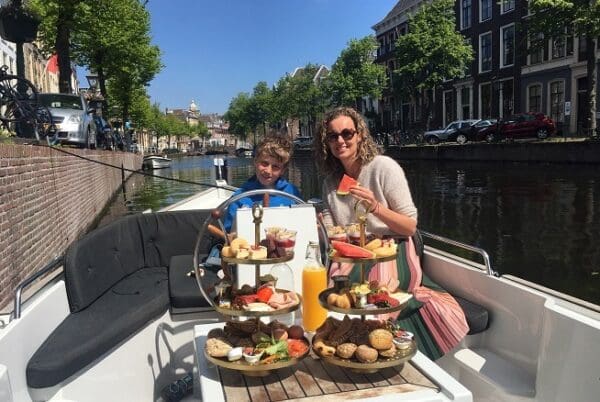 Normaal eet je de Pakhuis family brunch Deze link opent in een nieuwe tab in de fraaie binnentuin of in het mooie pand, maar speciaal voor Kidsproof Leiden mocht de brunch mee aan boord van de sloep. Wat een feestje.
