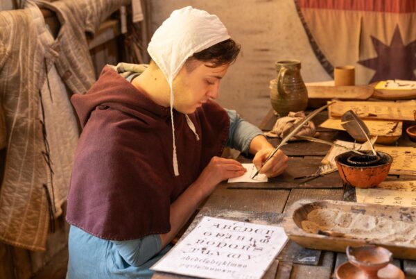 Eerst maak je prehistorische schilderingen op dierenhuiden, net als onze voorouders. Vervolgens schrijf je in een Romeinse tabula met een stilus. De Vikingen leren jullie runenschrift kerven en in de middeleeuwen ontdek je hoe kalligrafen sierlijke letters maken. Ondertussen zie je hoe perkament op ambachtelijke wijze wordt gemaakt.